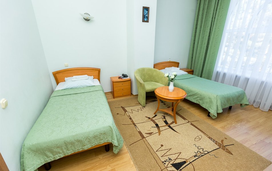 В номере: вешалка, зеркало, кресло, кровати односпальные /одна двуспальная кровать, прикроватные тумбочки, стол, столик журнальный, шкаф, телевизор, телефон, холодильник, чайный набор посуды, электрочайник